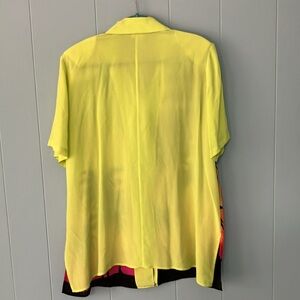 This previously owned 100% silk shirt is in excellent condition and feels luxurious to the touch. It has moderate shoulder pads and a scattering of clear sequins. Featuring a stunning blend of yellow, orange, pink, and black, this shirt is perfect for making a bold, fun statement. Ideal for casual outings or beach days.