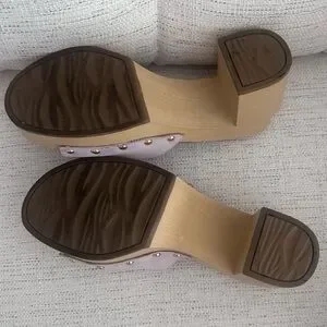 A wooden platform kicks up the retro appeal of a smooth leather sandal with round stud trim to further the effect.