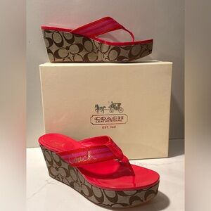 Elevate your style with these Coach wedges, featuring a striking combination of red and brown hues. The signature Coach monogram print adds a touch of elegance, while the wedge design offers both height and comfort. Perfect for making a bold statement, these shoes are a must-have for any fashion-forward wardrobe.