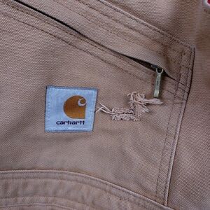 These Carhartt R04 BRN quilt-lined insulated bib overalls are in used condition and show signs of wear consistent with their age and prior use. This includes fading, minor scuffs, and light staining, which add to the authentic vintage character of the piece.