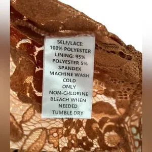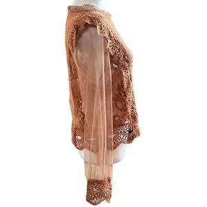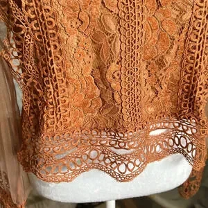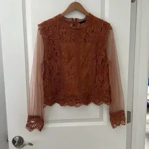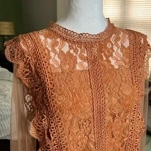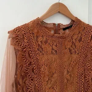 The top has a high neckline and sheer long sleeves with lace cuffs, giving it a delicate and feminine appearance. The warm, earthy tone, a burnt orange or terracotta, adds to its vintage-inspired look.