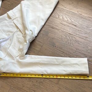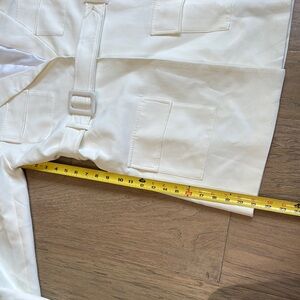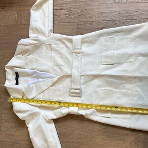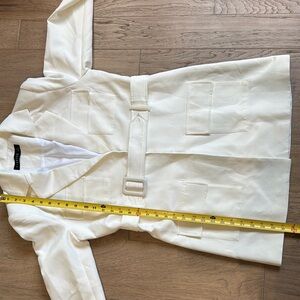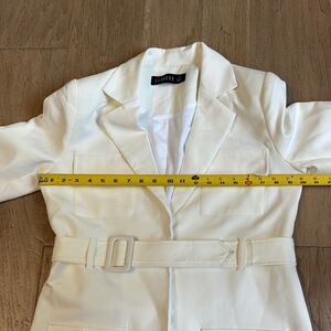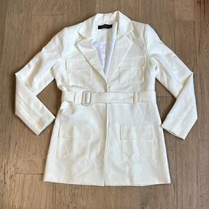 This Lioness blazer in a crisp white hue features a belted waist and notched lapels, offering a modern twist on a classic silhouette. Its structured fabric and tailored design make it a versatile addition to any wardrobe, perfect for elevating your style.