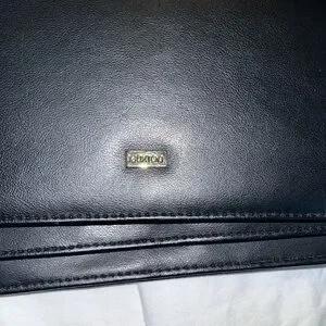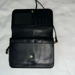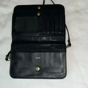 Buxton crossbody bag in black features a sleek, minimalist design with a smooth, matte finish. Its structured silhouette and adjustable shoulder strap make it a practical choice for everyday use. The subtle brand detail on the front adds a touch of elegance to its timeless style.