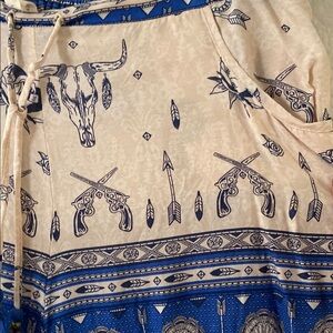 Vintage Spell Coyote print Blue and Cream Shorts, featuring a captivating bohemian/western themed print, playful tassels (with bells!), elastic waist, and hip pockets. The hip tassels can cinch up for a scrunched look. Waist 15 inches unstretched (can stretch to about 19 inches), side hem is 12 inches un-cinched. 100% rayon super breezy great for summer BBQs, festivals, rodeos, you name it!