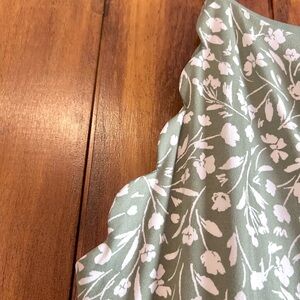Charming sleeveless dress with a floral pattern. Features a lovely green color with white floral designs and scalloped edges.