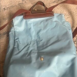 The Longchamp backpack showcases a sophisticated blend of blue nylon and brown leather, offering a timeless and versatile design. Its foldable structure and minimalist aesthetic make it a practical choice for everyday use. The quality craftsmanship ensures durability and style in one elegant package.