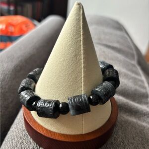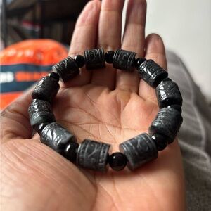 Stylish jadeite beaded bracelet with intricate designs. Perfect for any occasion. 100% Natural Wuji Jadeite carved cylinder shaped beads and jadeite black round spacer beads. Elastic band.