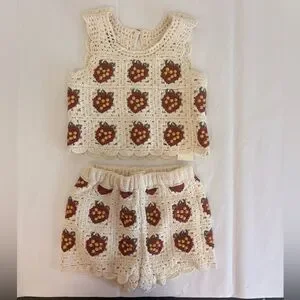 The most beautiful summer crochet set in cream, featuring an adorable strawberry pattern. It includes a cropped camisole with a button at the back and elastic-waist shorts.