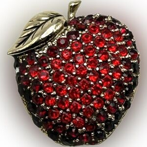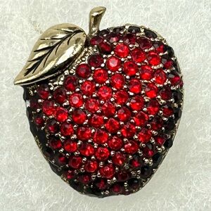 This exquisite brooch showcases a whimsical apple design adorned with deep red and black crystals in a pavé setting. The piece is accentuated by a metallic leaf detail, adding a touch of elegance and contrast. Perfect for making a bold statement, this brooch is a must-have accessory for any jewelry collection.