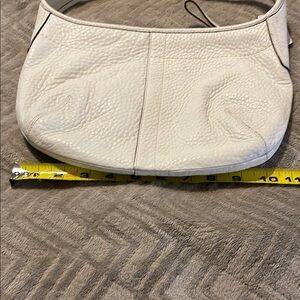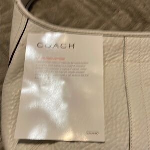This Coach hobo bag in white features a sleek, minimalist design crafted from high-quality textured leather. Its curved silhouette and single shoulder strap make it a versatile accessory for everyday use.