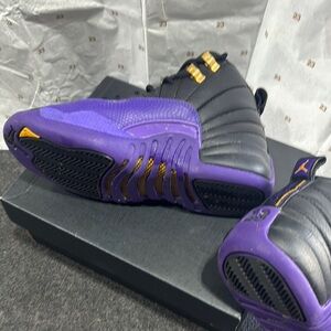 Stylish Jordan shoes. Black leather with purple accents. Gold eyelets for a premium look.
