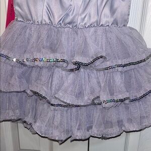 Charming lavender dress with elegant ruffles and sequin details. Perfect for special occasions. Skirt is Beautifully layered with tulle and sequins. Soft silk like top with tulle lining