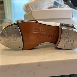 Stylish black and white tap shoes by Miller & Ben Triple Threat Royal. Perfect for dance enthusiasts.
