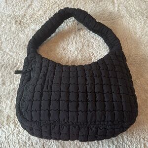 This black hobo bag features a sleek quilted texture, offering a contemporary and minimalist aesthetic. Its structured shape and matte finish make it a versatile accessory for any urban setting. Crafted with attention to detail, this bag combines style and functionality effortlessly.