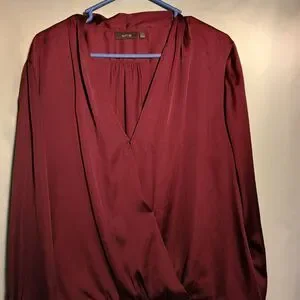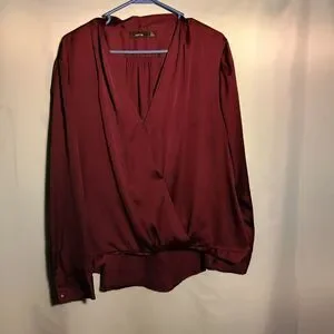 Shop this sophisticated burgundy satin wrap blouse featuring a deep V-neckline and long sleeves. Perfect for work, date nights, or special occasions. Stylish, soft, and versatile.