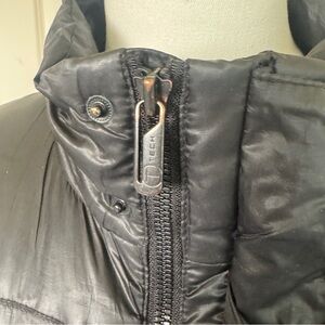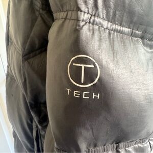 Tech by Tumi black puffer jacket in men’s size large. Features a zip-up front with snap closure, vertical zip chest pocket, and two front hand pockets. There is a small tear at the top of the left front pocket (photographed), and some feathers occasionally poke through the fabric. Lightweight and insulated—great for travel or everyday cold-weather wear.