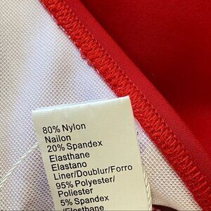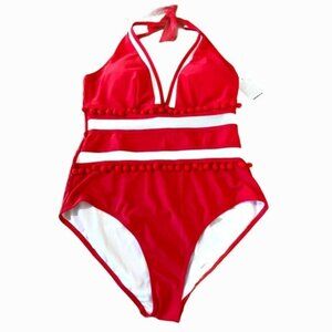 New! Deep V halter style top with tie at neck. Full coverage high cut bottoms. Color is Red and White. Hanging Pom poms on top and waist. Mesh cut out details. 82% Nylon 18% Spandex. Size 16