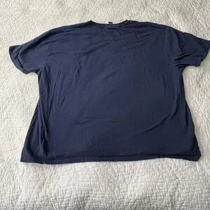 Navy t-shirt featuring a bold yellow graphic print. Casual and stylish.