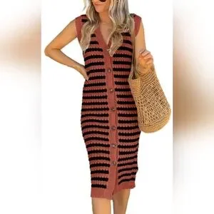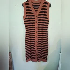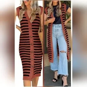 Stylish black and rust striped knit cardigan with button-down front. Perfect for layering.