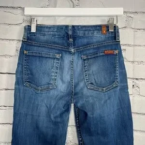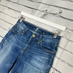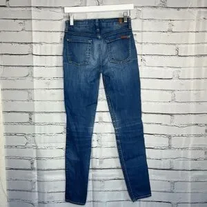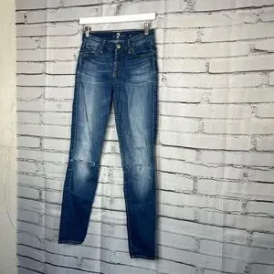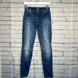 7 For All Mankind skinny jeans in size W25 L29, featuring a classic medium blue wash with stretch for all-day comfort. These high-rise, tapered-leg jeans combine flattering fit with premium denim quality—perfect for casual outfits, stylish layering, or streetwear styling.