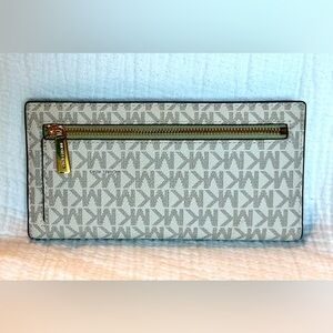This Michael Kors wallet showcases a sleek gray and green color palette, highlighted by the brand's iconic design. Crafted for those who appreciate both style and functionality, it offers a refined touch to any ensemble.