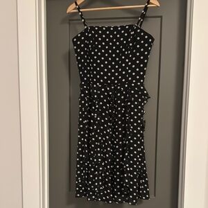 Chic and stylish black dress with white polka dots and optional belt. Perfect for any occasion. Size 8 but fits more like a 6.