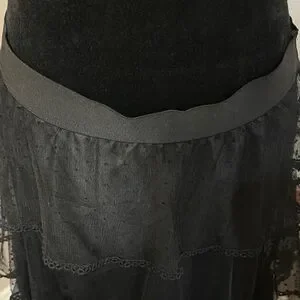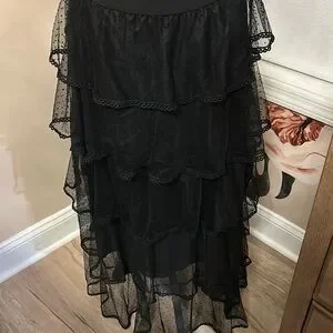 This elegant black midi skirt by Studio West showcases a sophisticated tiered and ruffled design, perfect for cocktail events. Its flowing layers add a touch of movement and grace, making it an ideal choice for a stylish night out. Crafted from lightweight fabric, it ensures both comfort and a chic appearance.