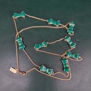 Kate Spade Take a Bow necklace has Green Enamel Bows on a gold plate chain.30 inches long with a lobster clasp. Very good condition.