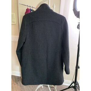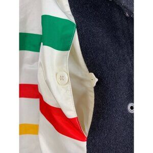 This Pendleton wool coat offers premium warmth and timeless style. Featuring a charcoal gray exterior with a vibrant striped lining, it blends functionality and sophistication effortlessly.