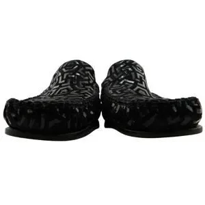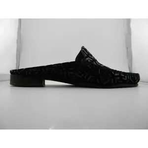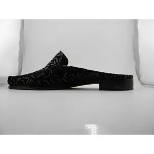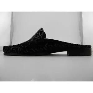 Material Composition: Leather sole and heel, likely suede or velvet upper with geometric textured overlay, rubber heel caps.