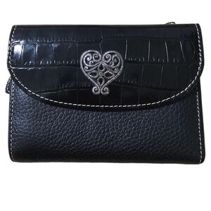 Brighton - Small black crocodile-embossed leather crossbody wallet with a heart-shaped silver clasp and detachable strap. Trifold wallet , in the interior there're 2 card slots, ID window, clips to attach strap,2 long open pockets and 1 zippered pocket with heart shaped zipper pull. Exterior has a snap closure with silver heart embellishment. 2 zippered pockets for coins or more credit cards. Pre-loved no signs of wear. 6"L x 1" W x 4"H.