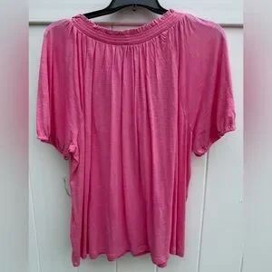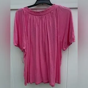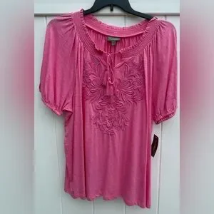 Style & Co Short Sleeve Blouse With Embroidered Floral Print On The Front. Vibrant Pink Color. Size 3X. NWT. V-Neck With Corded Rope And Frayed Ends. Elastic Around The Neckline And The Bottom Of The Sleeves. Raglan Sleeves. 60% Cotton 40% Modal. This vibrant pink blouse from Style & Co features a raglan sleeve design and a relaxed fit, perfect for a casual yet stylish look. The tie front detail adds a touch of elegance, while the soft fabric ensures comfort throughout the day.