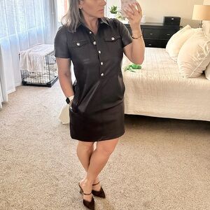 The luxe life. The deets: chocolate faux leather pocket mini dress | color: iced espresso | new w. tags | add this luxe faux leather mini shift dress w. plenty of pockets & metallic button trim for a sleek & chic modern edge to any day from work to play | this piece features + point collar + short sleeves + button flap chest pockets + button front + welt pockets + shift silhouette (fits straight & relaxed) | 33" length from center back neck to hem | shell: faux leather & lining: 100% polyester | machine washable | be a responsible buyer- contact for questions | no trades or lowball offers pls
