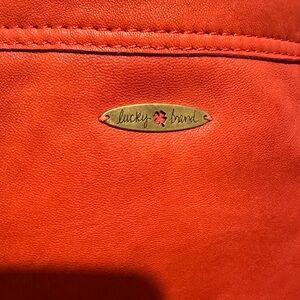 This Lucky Brand tote bag features a striking orangey red sheep leather exterior, offering a relaxed and unstructured silhouette. Its casual design and roomy interior make it a practical yet stylish accessory for everyday use. This bag is smooth like butter. It is so soft! this bag is New with Tags and has no callouts to speak of.
