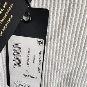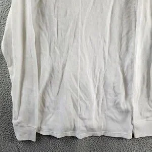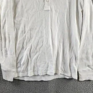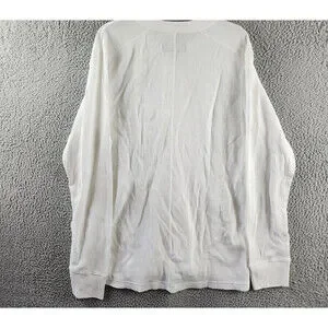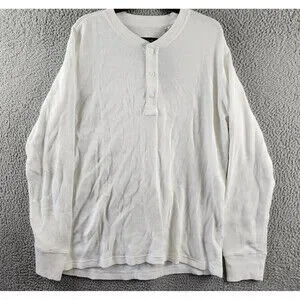 The rag bone Waffle Knit Henley Top in Men's XL is a classic white long sleeve pullover made from 100% cotton. It features a Henley neckline with button accents and a solid pattern. This breathable shirt is perfect for the fall and spring seasons and has a regular fit, making it a versatile and comfortable wardrobe staple for men looking for a stylish yet timeless piece.