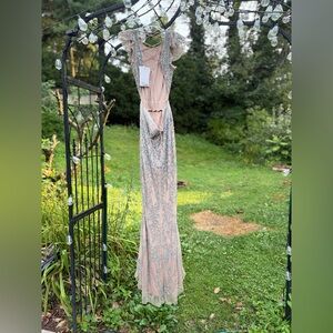 Chic pink maxi dress with intricate embellishments. Features delicate cap sleeves and a flowing silhouette. Ideal for elegant events.