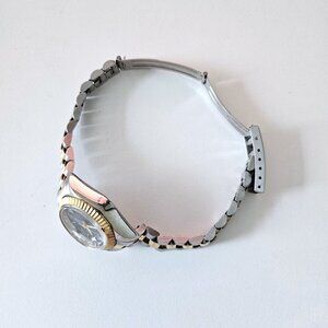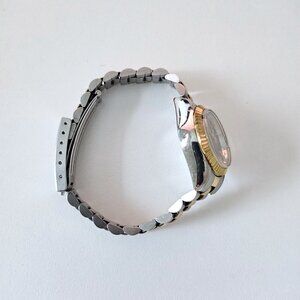 FEATURES/STYLE TIPS: This classic watch features and two-tone gold and silver band, a gold fial fluted bezel and hands, jewels at the 6:00 and 12:00 positions, and a magnified date window. It has quartz movement and is water resistant to 100 ft.