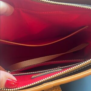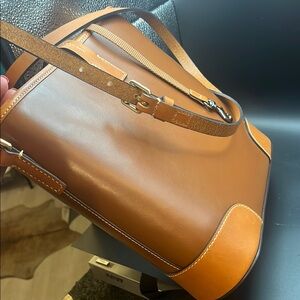 Elegant tan leather shoulder bag by Dooney & Bourke. Features a sleek design with a secure clasp and adjustable strap.