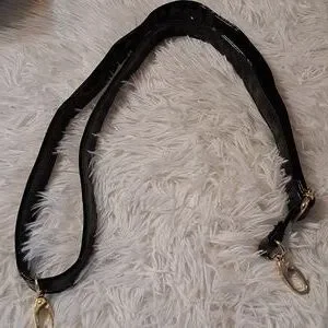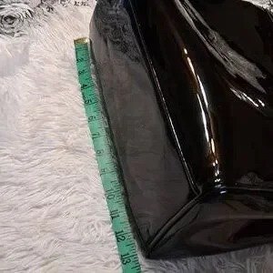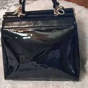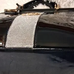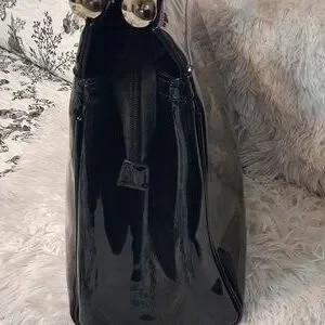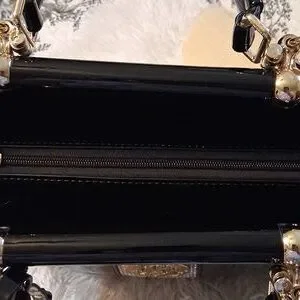 This stylish handbag features a sleek black design with elegant gold accents, perfect for any occasion. Its sophisticated look is enhanced by the shimmering silver embellishments right down the center. making it a must-have accessory. I am going to say this bag is pre-loved, showing minor signs of wear. The lining is in like new condition. This patent handbag has 2 inside zip pockets, 2 open pockets, an adjustable strap that can be worn as a shoulder bag or a crossbody, and a zip top closure. Please see all the pictures for the details and measurements. 207/09/25DRURO