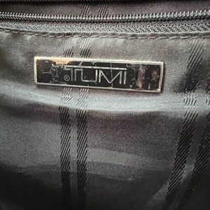 This Tumi laptop bag/briefcase is black leather and fabric mix and in preloved condition. Signs of wear include scratching to the leather and hardware and a missing shoulder strap. The black striped interior lining is intact and clean. The interior has a zippered pocket, two pen holders and two open pockets. There are two open pockets on the exterior.