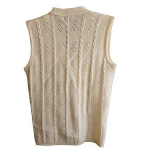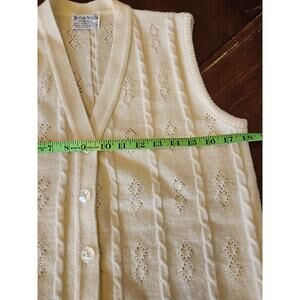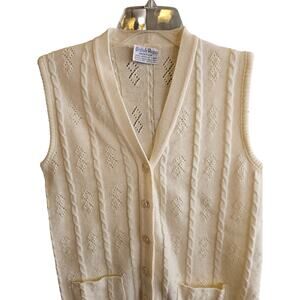 Elegant cream knit vest by Softwear. Features a delicate pattern and button front. Perfect for layering.