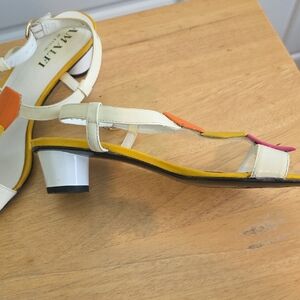Step out in style with these sandals. Featuring vibrant pink, orange, and yellow accents, these shoes are perfect for adding a pop of color to any outfit. Enjoy comfort and elegance with every step. I love the round heel!
