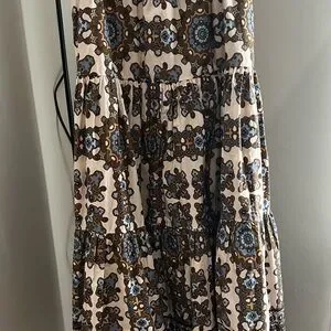 Stylish bohemian dress with intricate patterns. Features shades of brown, blue, and cream.