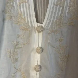 Chic white blouse with delicate embroidery. Features button-down front and long puffy sleeves. Perfect for versatile styling. 100% cotton. Embroidery 100% polyester. Sz S