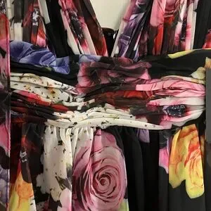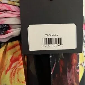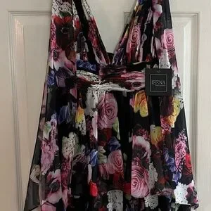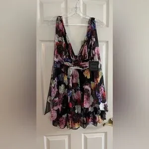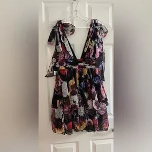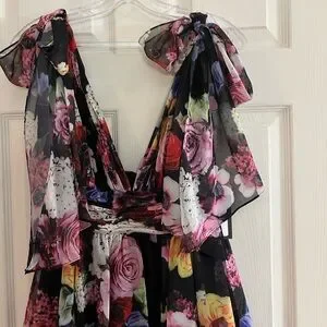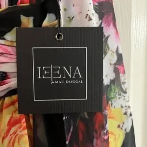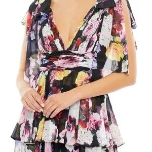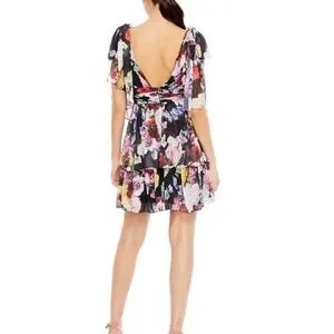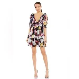 IEENA for Mac Duggal NWT Elegant mini dress with vibrant floral patterns. Features a deep V-neck and layered skirt. Perfect for special occasions.