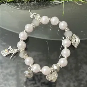 Elegant Silver and White Pearl Bracelet with Heart Charms