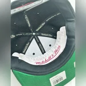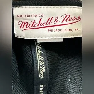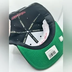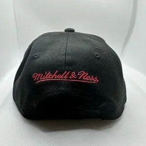 This Mitchell & Ness snapback hat showcases a striking black design with a bold red Chicago Bulls logo on the front. Crafted from durable materials, it features a flat brim and embroidered details, making it a standout accessory for any fan. The iconic Mitchell & Ness branding adds an authentic and nostalgic touch to this stylish hat.