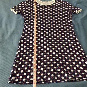 Red, white, and blue floral print designer t-shirt dress with white trim. 90s babydoll style. Fabric tag is missing but feels like cotton.