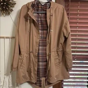 Stylish tan hooded jacket with plaid lining. Perfect for casual outings.