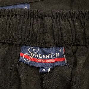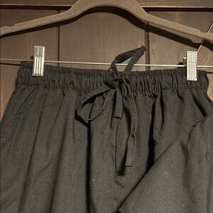 This black scrub set is crafted from a durable, wrinkle-resistant fabric, ideal for healthcare professionals. The set includes a V-neck top and full-length pants, designed for comfort and practicality in medical settings.